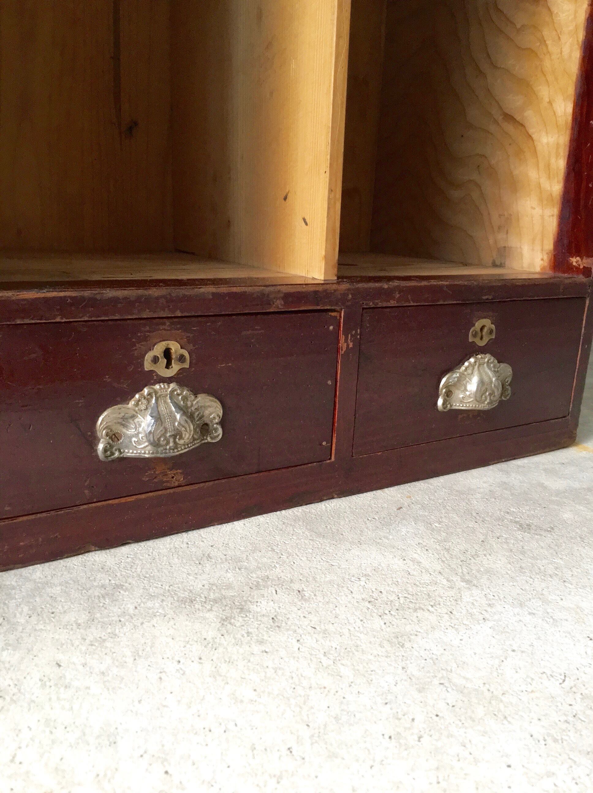 古い収納棚になりますので、スレや剥げ、当たりキズ、割れ、欠け、落としきれない汚れなどがあります。棚中の板は、取り外しが可能です。引出し中は少し汚れがありますが、開閉はスムーズに行え、日常気軽にお使いいただけます。全体的に状態も良いのでまだまだ実用的に活躍してくれます。