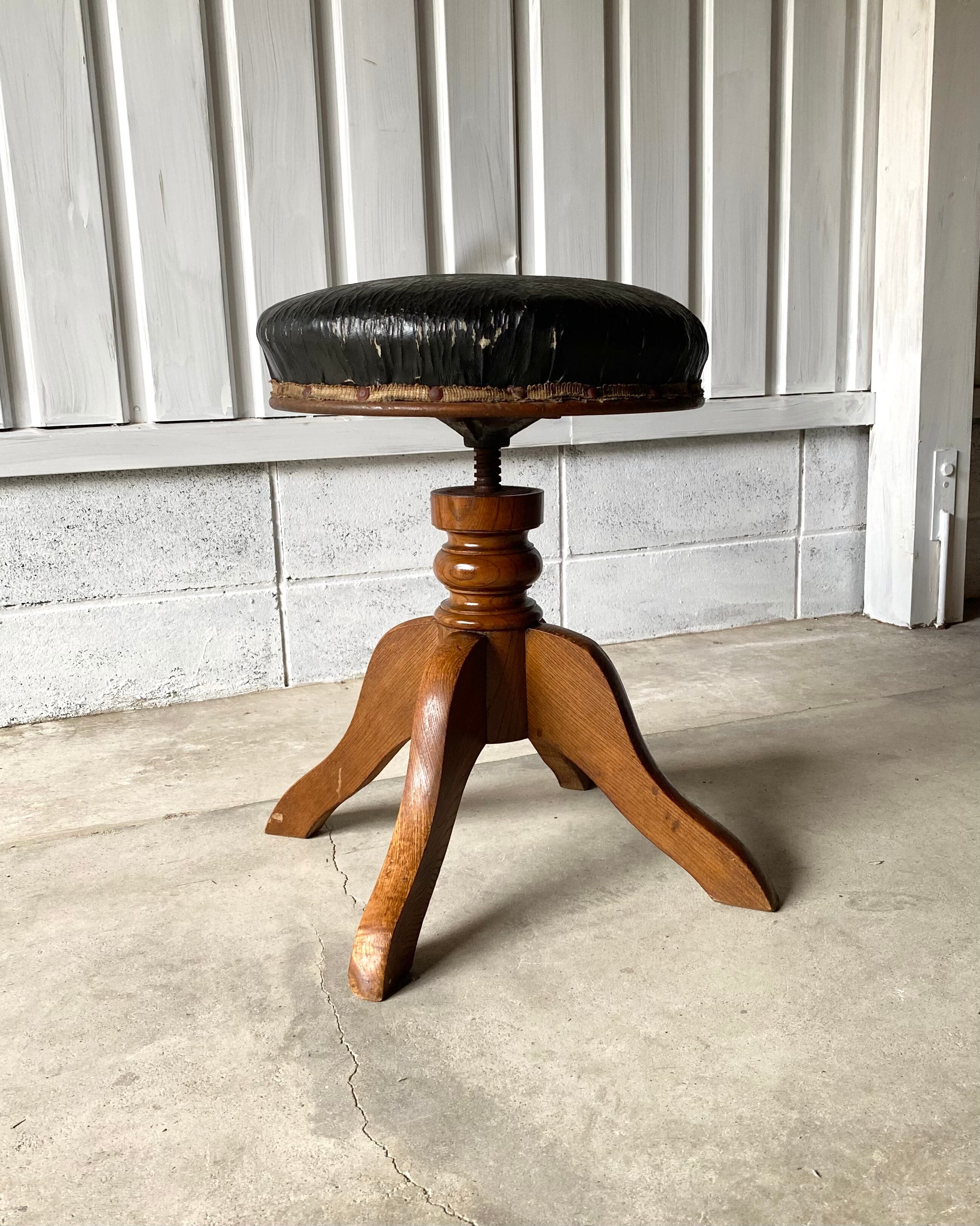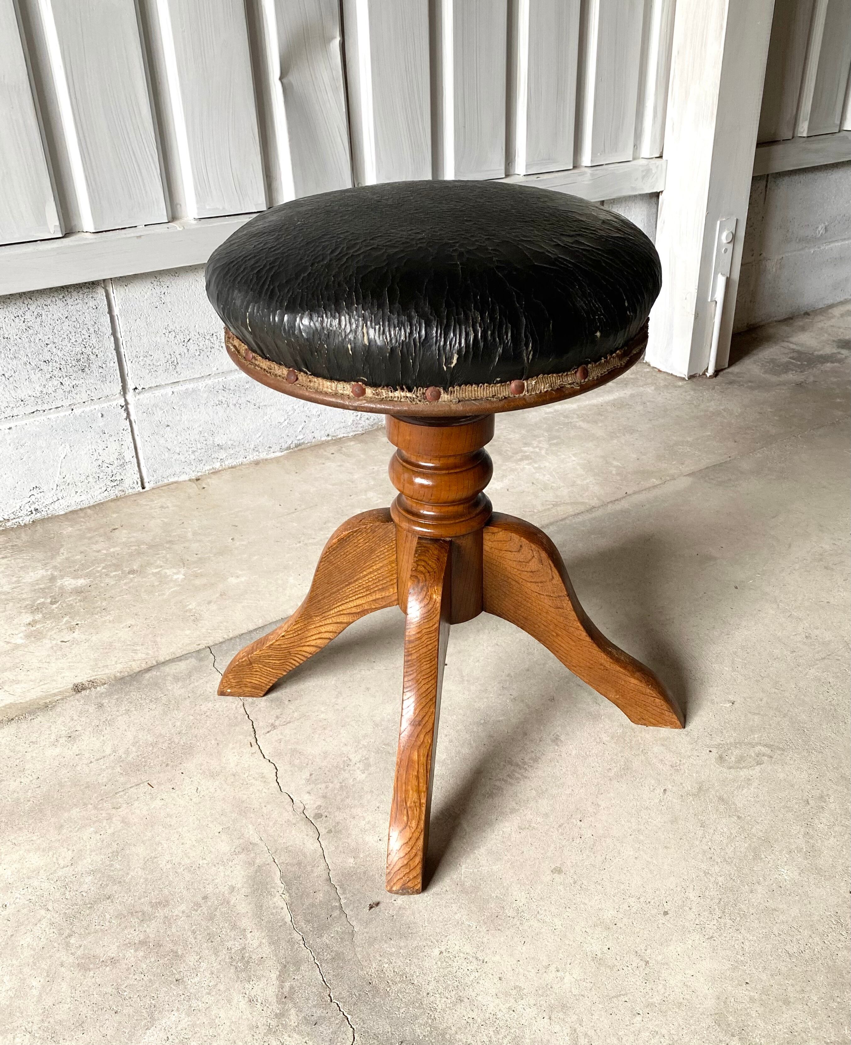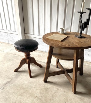 経年変化の落ち着きある木肌と味のあるレザー、上品な佇まいが感じ良い回転スツール。作業テーブルの椅子としてや、ダイニングテーブルの椅子として違う椅子と組み合わせて使ってみたり、玄関先やキッチンの腰掛け椅子としても素敵です。