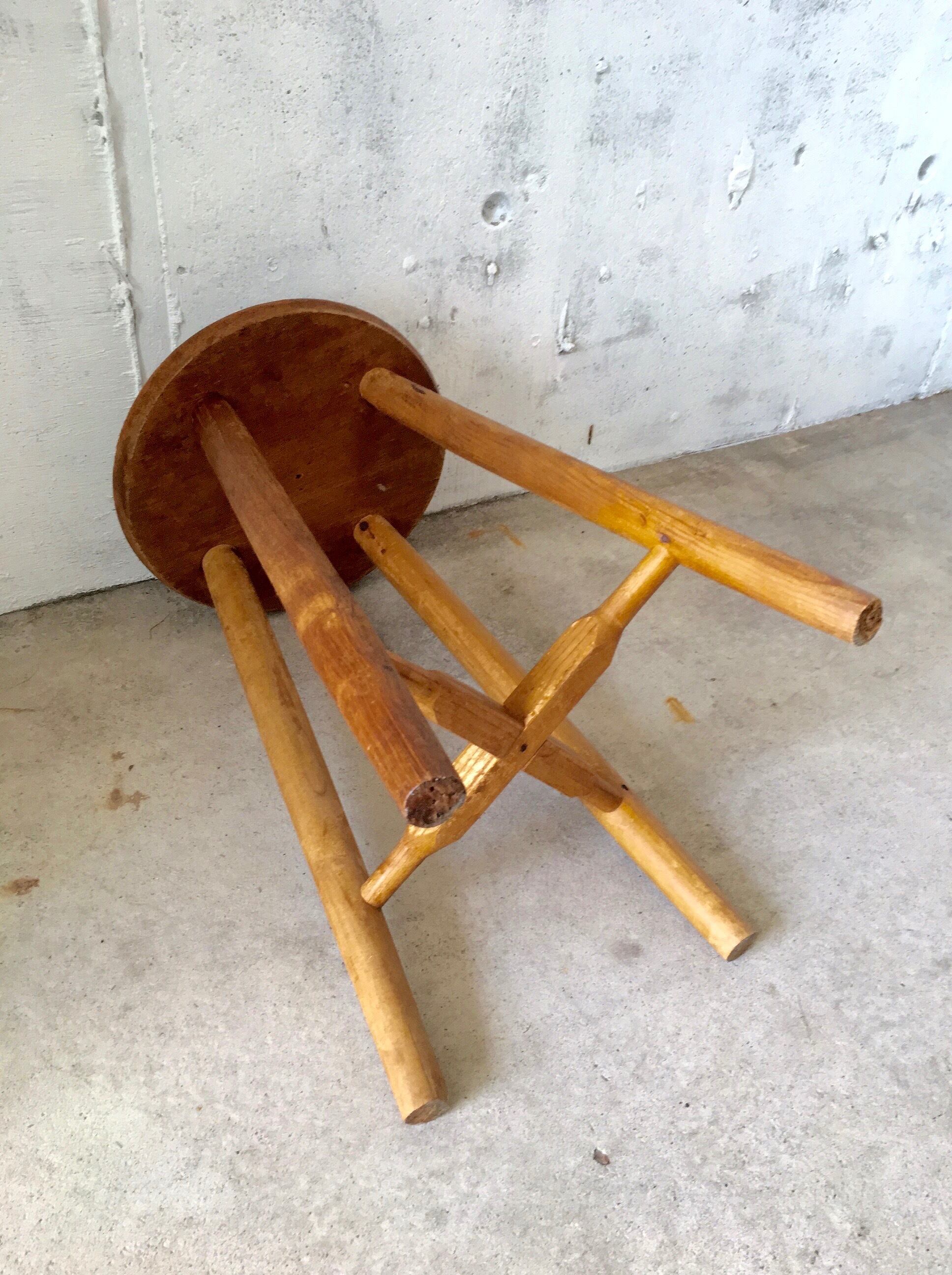 古いスツールになります。スレや剥げ、割れ、当たりキズ、落としきれない汚れなどがあります。少しのがたつきはありますが、しっかりとした造りで全体的に状態も良いので、まだまだ実用的に活躍してくれます。