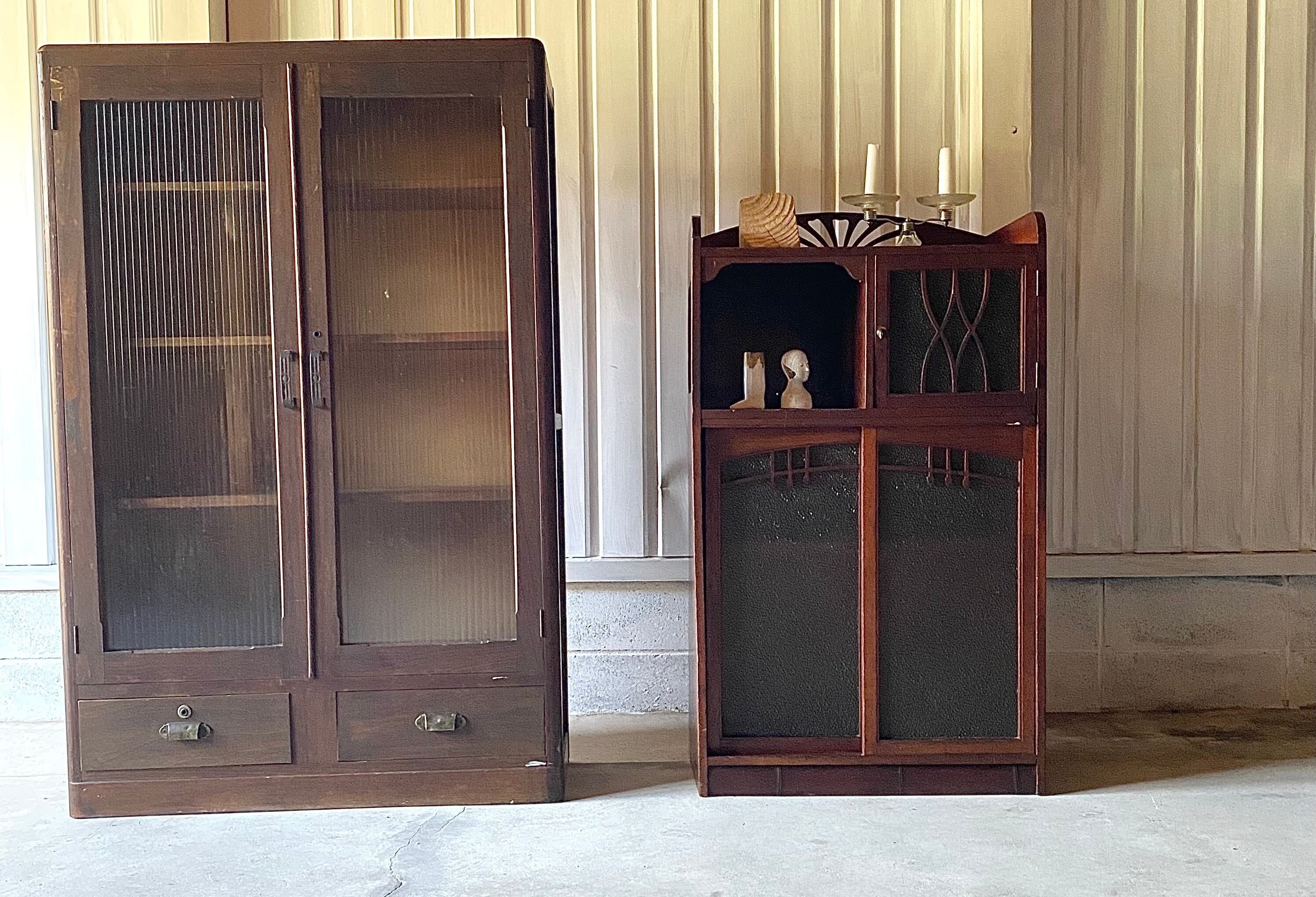 経年変化の雰囲気ある木肌とレトロなガラス、個性のある姿が感じ良い収納棚。キッチンで食器や調味料の収納としてや、リビングや趣味部屋で本や小物の収納としても素敵です。