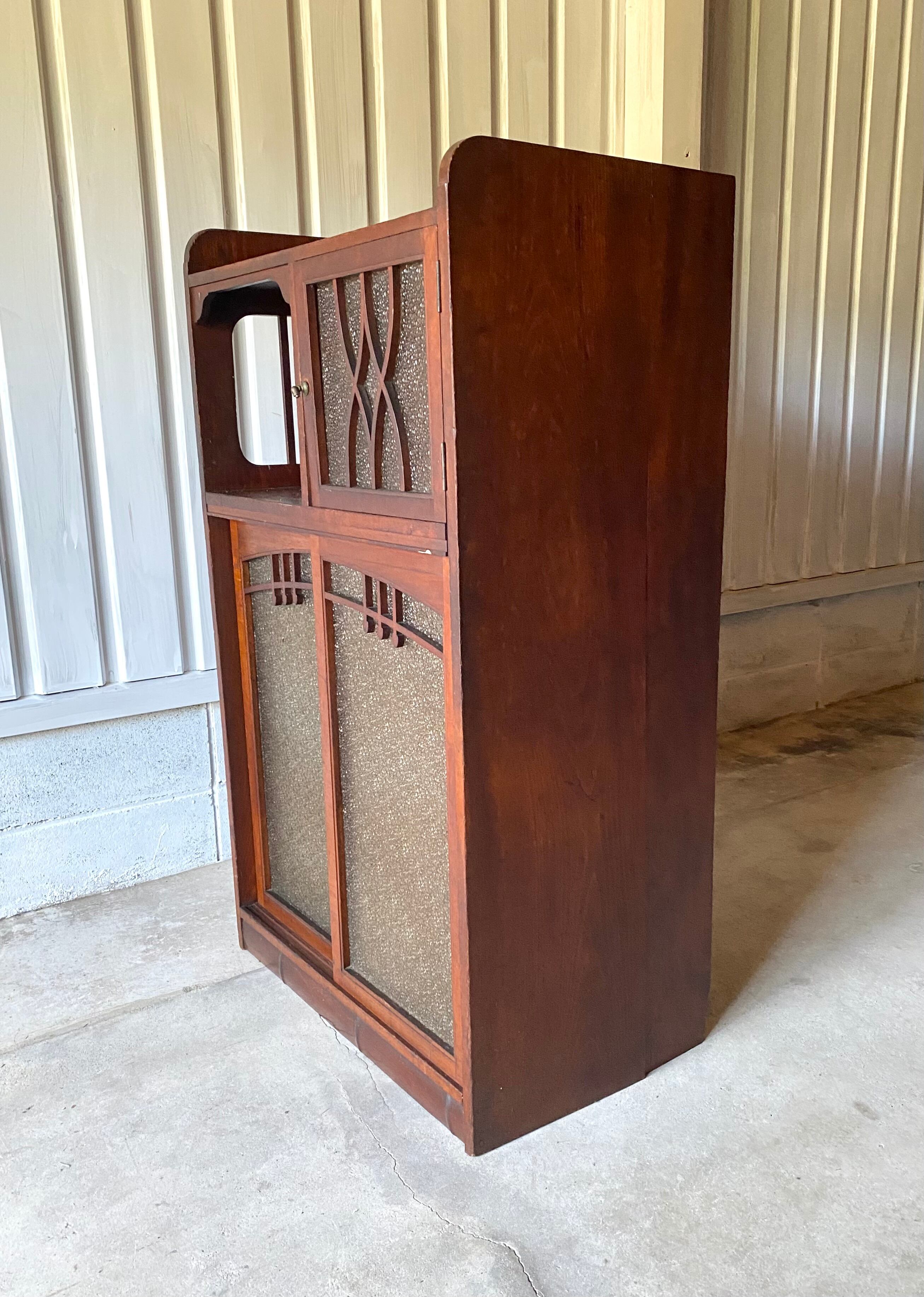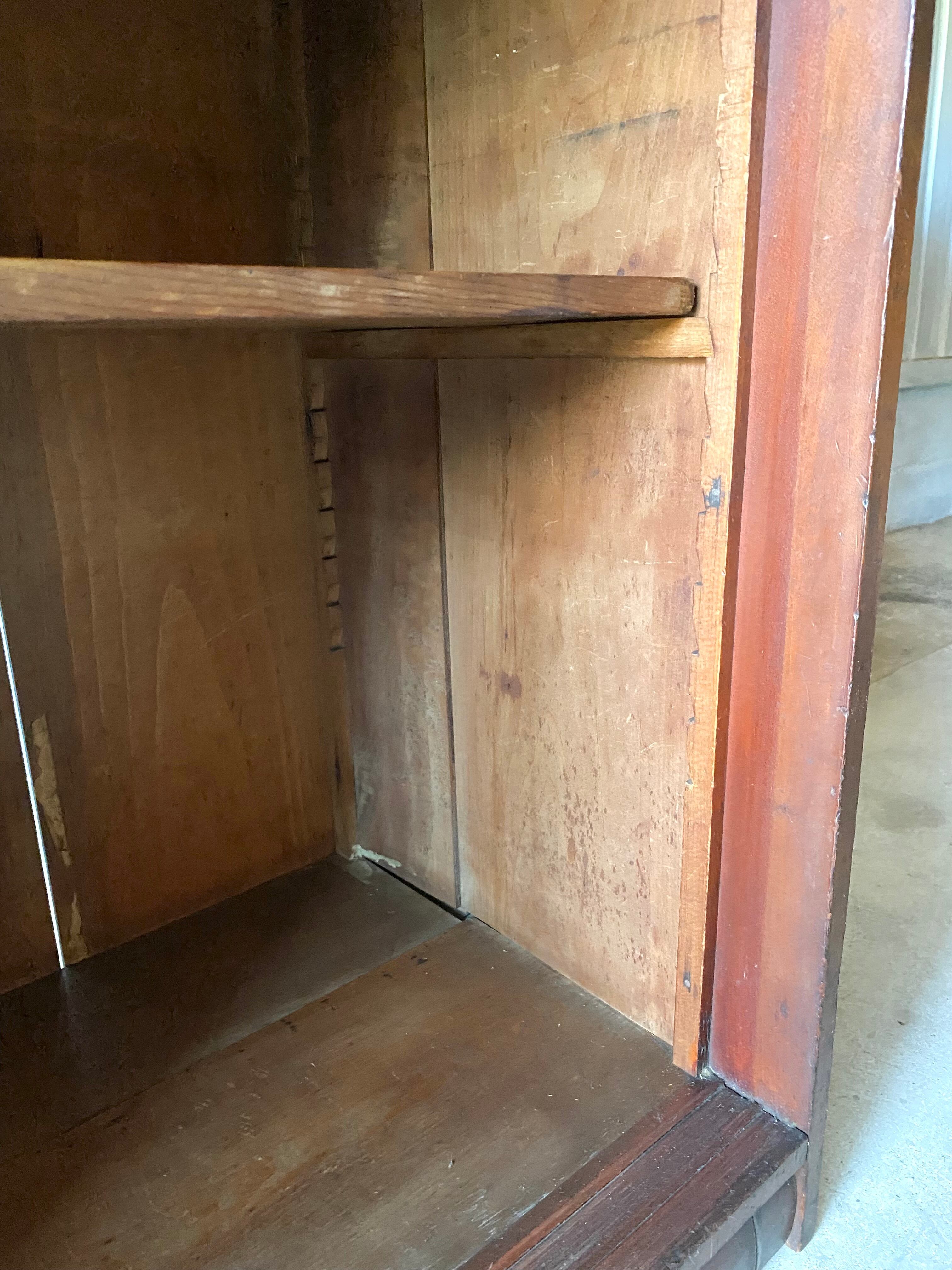古い収納棚になります。スレや剥げ、反り、欠け、サビ、当たりキズ、落としきれない汚れなどがあります。扉、引戸の開閉は比較的スムーズに行えます。特に目立つガラスの割れはなく、全体的に状態も良いのでまだまだ実用的に活躍してくれます。