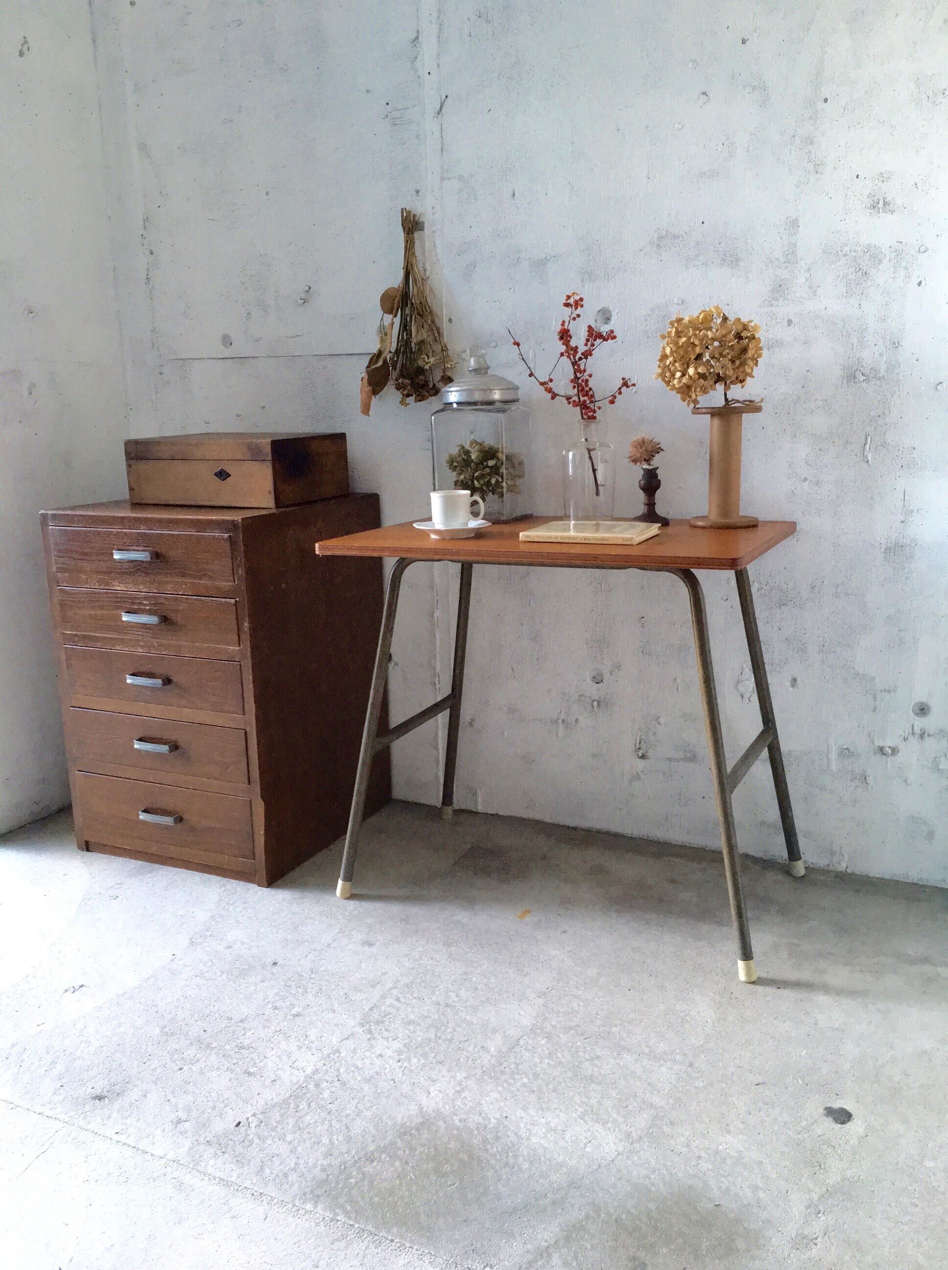 雰囲気の良い古材板と古い鉄脚が良く馴染んだサイドテーブル。ソファ横や寝室でサイドテーブルとして使ってみたり、植物や小物を感じ良くディスプレイして、置いてみても素敵です。ショップさんの店舗什器として、ショップカードなどを置く台などとしてもオススメです。