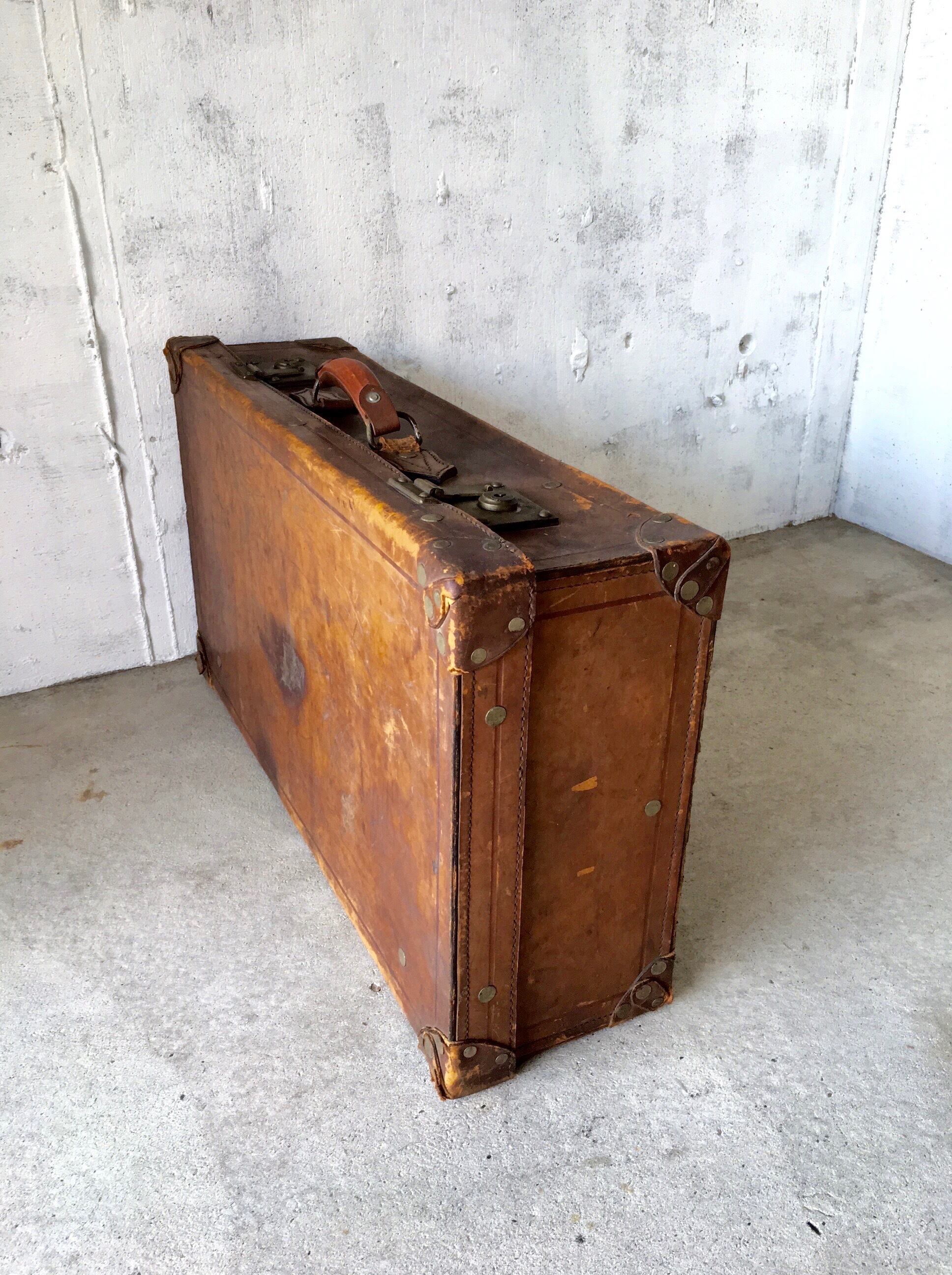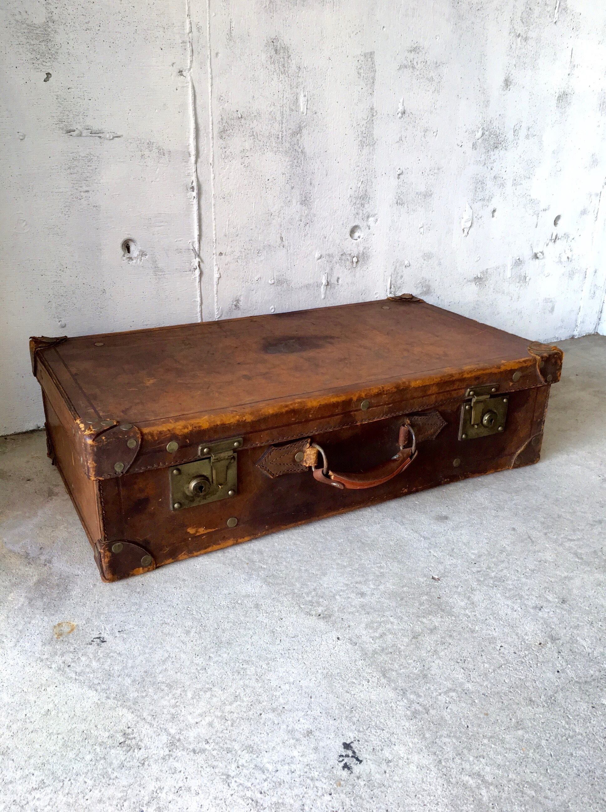 使い込まれて素敵な雰囲気を放つ革製のトランク。トランクの開閉は比較的スムーズに行えます。お部屋で細々した物を収納しながらインテリアの一部として飾って置いてみたり、実用以外にドライフラワーなどを入れてディスプレイしてみても感じ良さそうです。