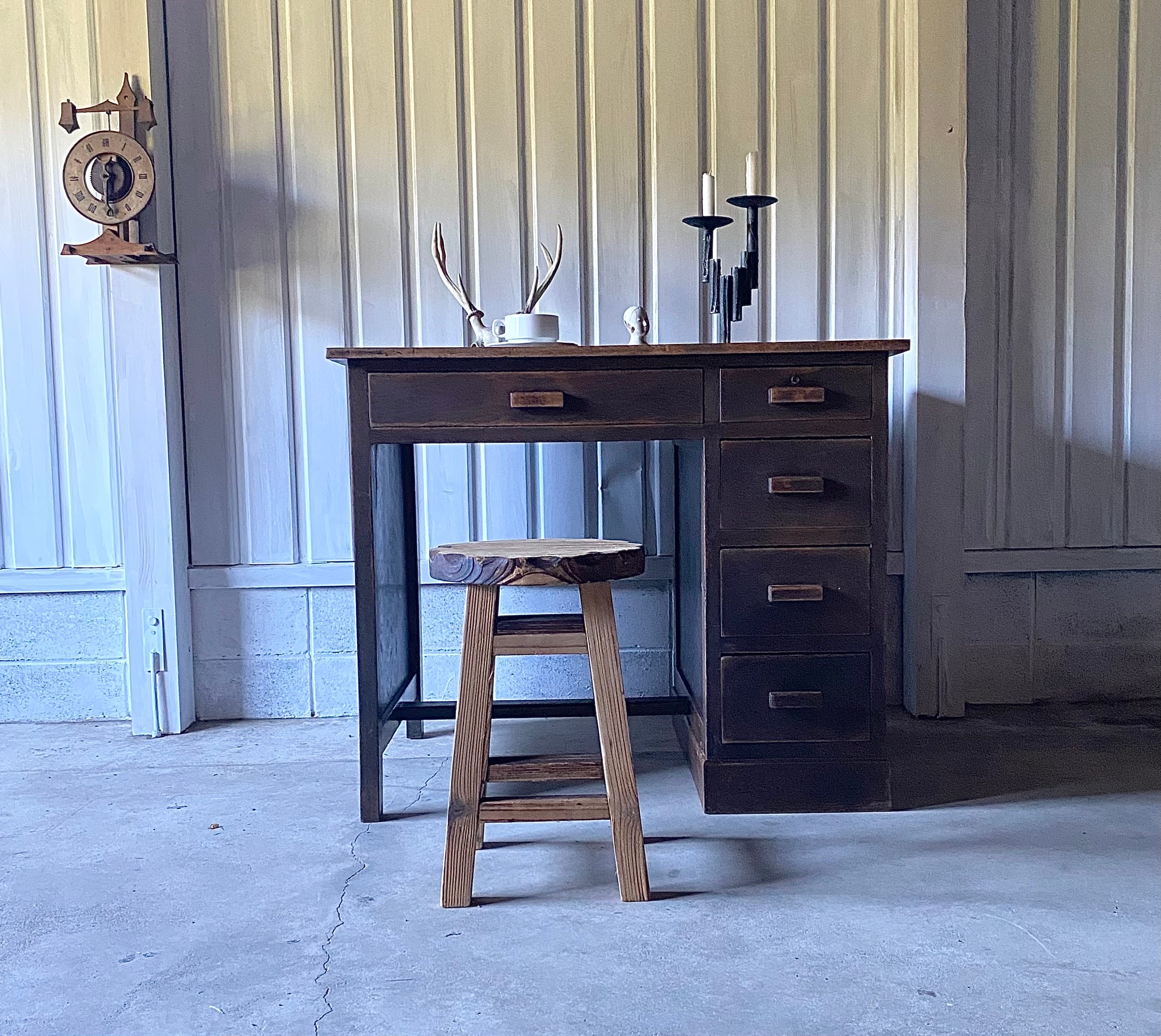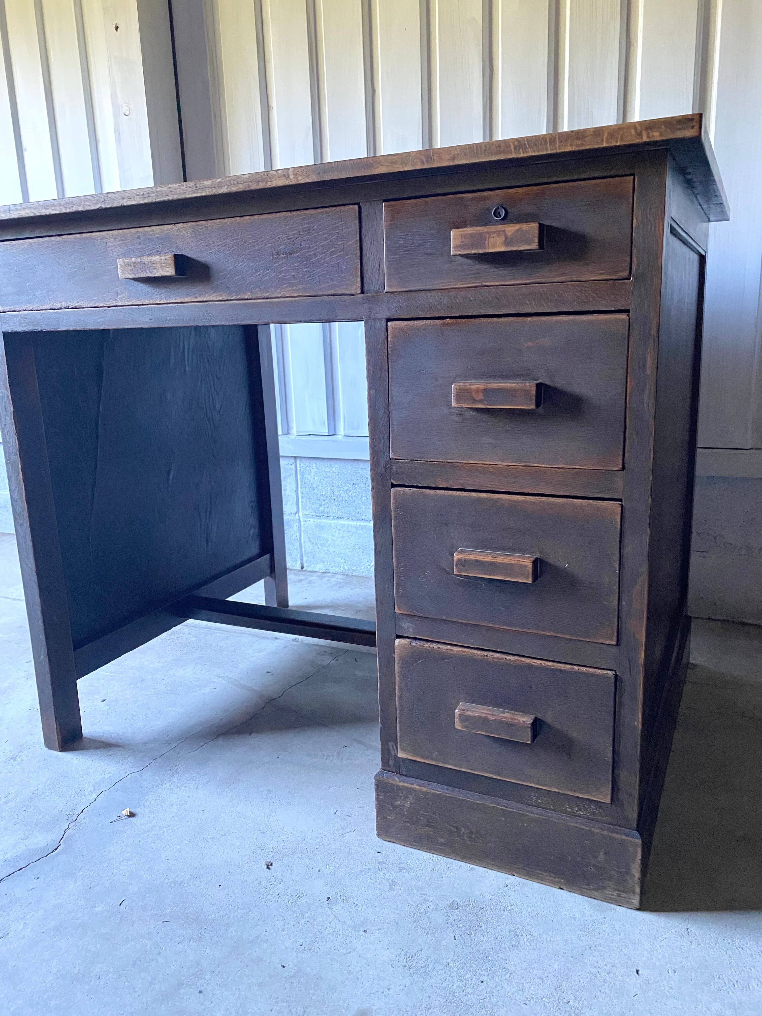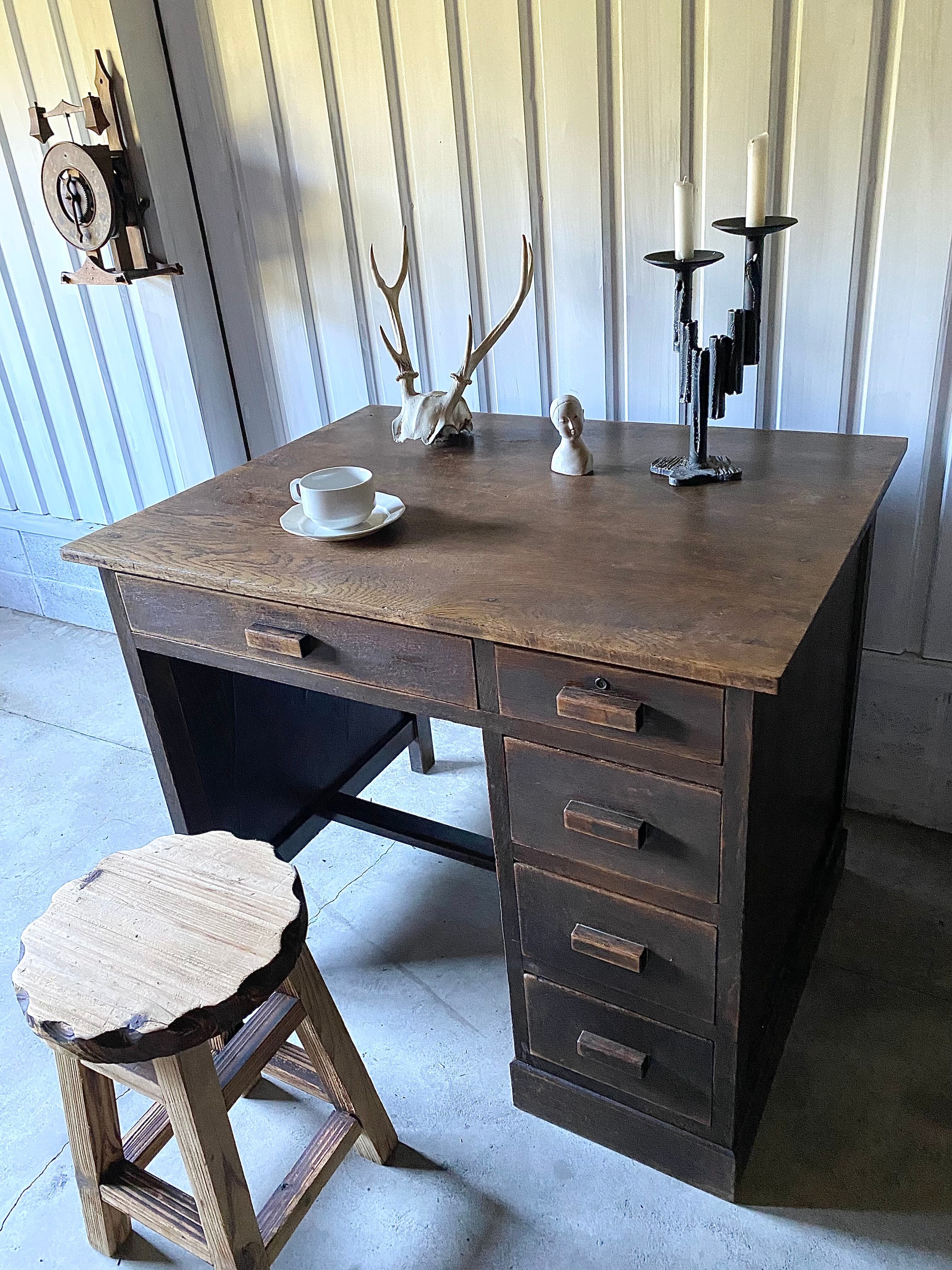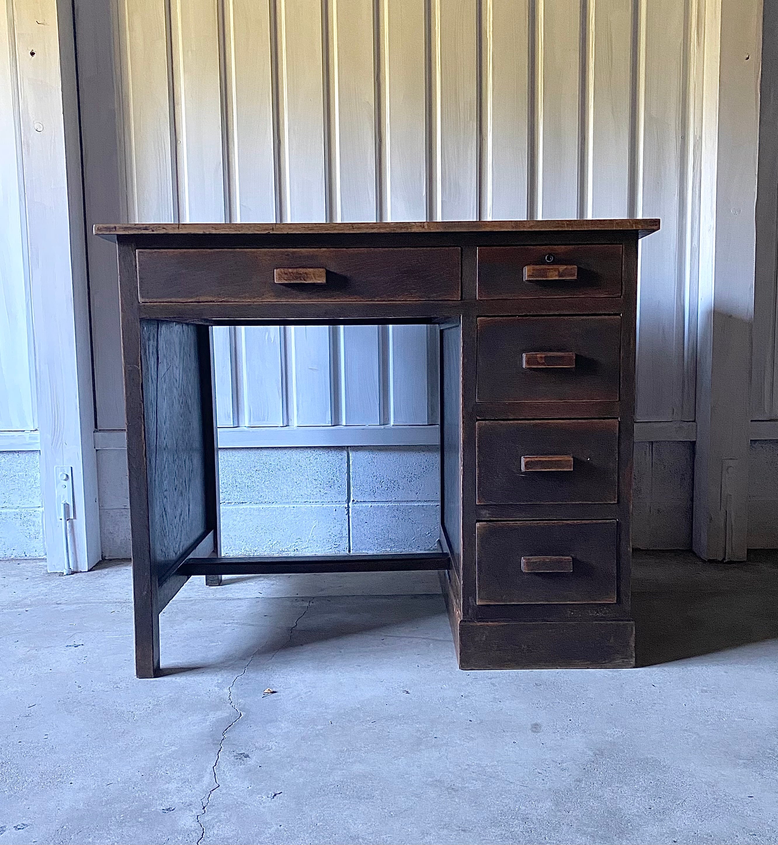 古い木製デスクになります。スレや剥げ、当たりキズ、欠け、落としきれない汚れなどがあります。引出しの開閉は比較的スムーズに行えます。全体的に状態も良いのでまだまだ実用的に活躍してくれます。