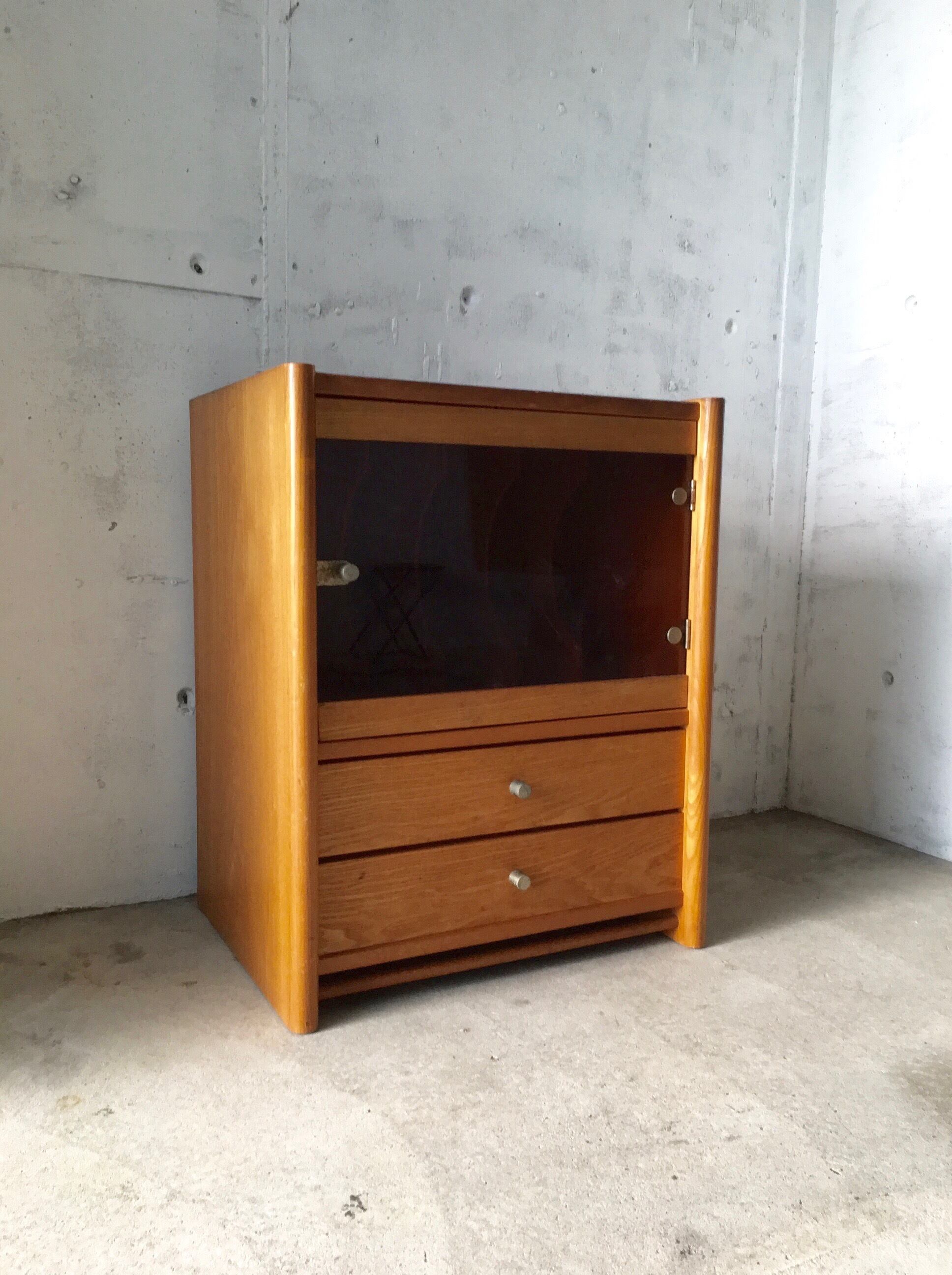 古い収納棚になります。スレや欠け、割れ、当たりキズ、落としきれない汚れなどがあります。ガラス扉は特に割れもなく、引出しの開閉も比較的スムーズに行え、日常気軽にお使いいただけます。全体的に状態も良いのでまだまだ実用的に活躍してくれます。