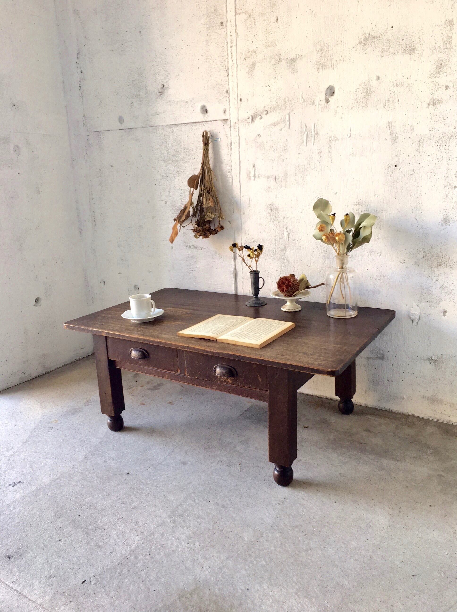 経年変化の良い木肌、雰囲気のある取手が感じ良いローテーブル。少しのがたつきはありますが、状態は良好です。お気に入りの小物や植物などをお部屋で飾ってみたり、実用使いで作業テーブルとしてや、お子さんの勉強机としても素敵です。
