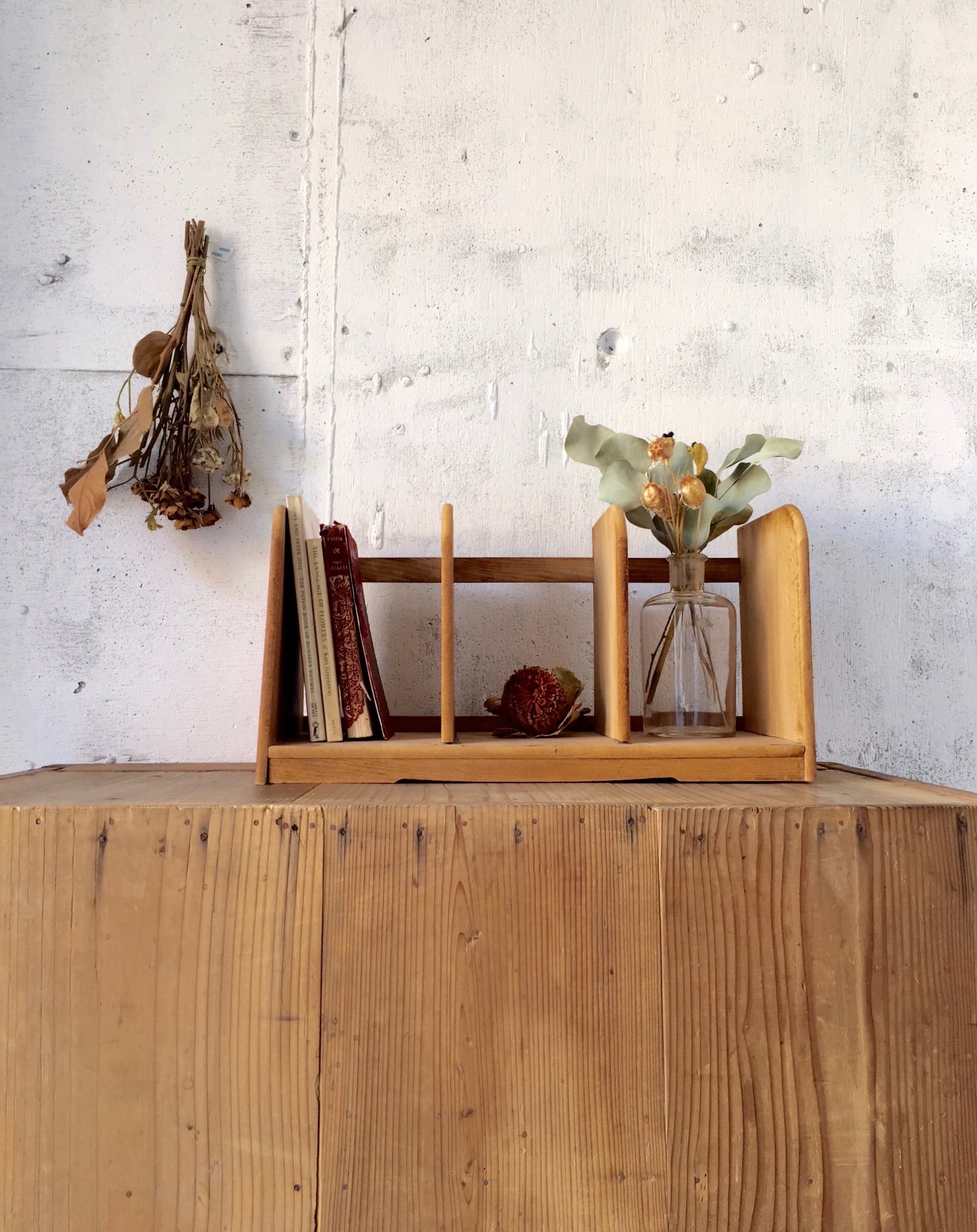 ナチュラルな木味が心地よい、雰囲気の良い本立て。長年の使い込まれた味わいが、物の良さを際立てています。しっかりとした造りで、比較的軽量なので持ち運びやすいです。卓上でお気に入りの本と一緒に植物や小物などをディスプレイしながら置いてみると素敵な空間演出が出来そうです。
