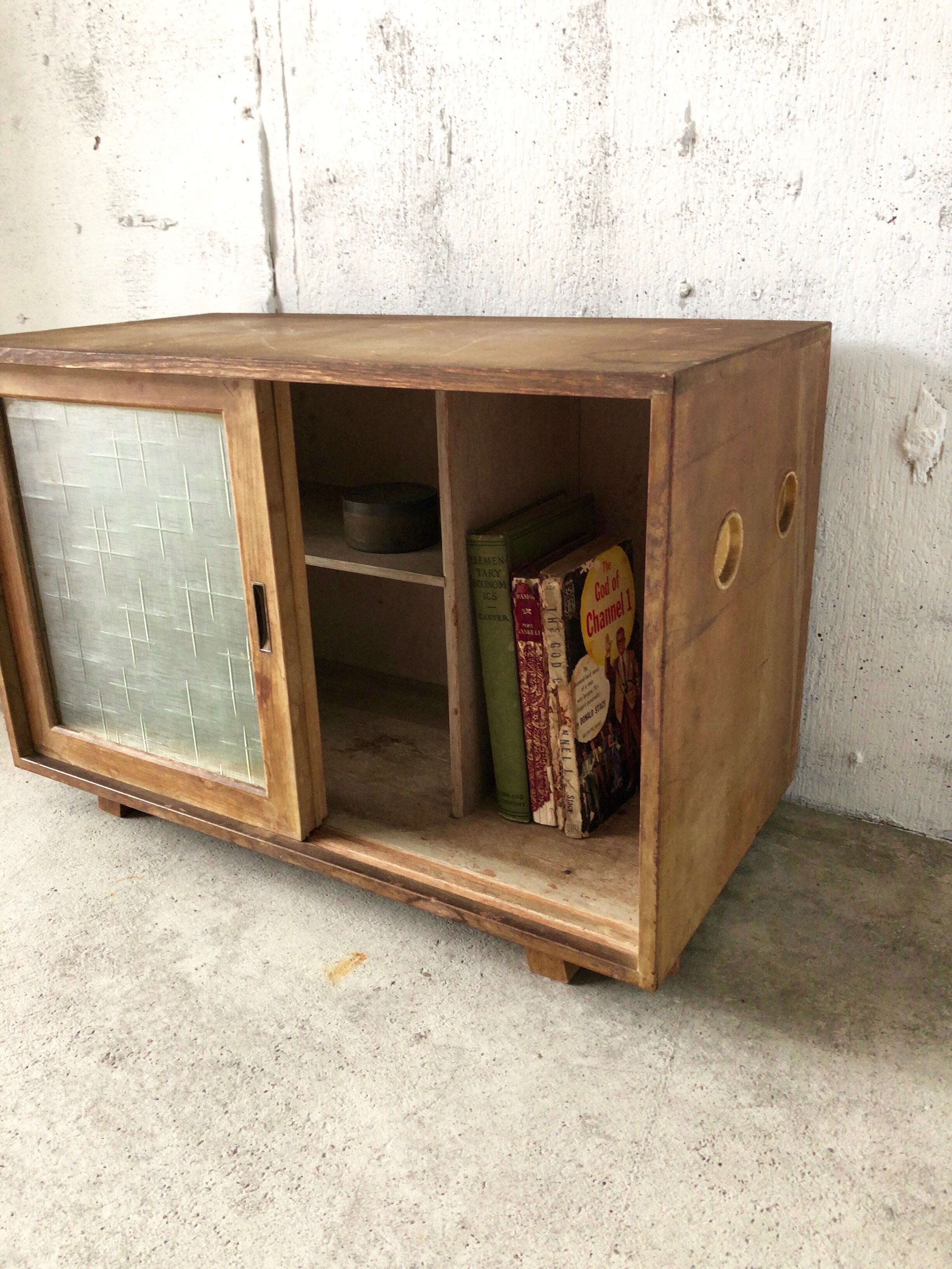 シンプルながら経年変化による深みは空間に落ち着きを与えてくれるガラス戸棚です。小ぶりなサイズ感が可愛らしくて使い易く、収納力も十分です。経年による傷などもありますが、収納扉の開閉も比較的スムーズに行え、使用上問題なくお使いいただけます。食器棚や小物、本などの収納棚として、毎日の暮らしの中で手元に置いてお役立てください。