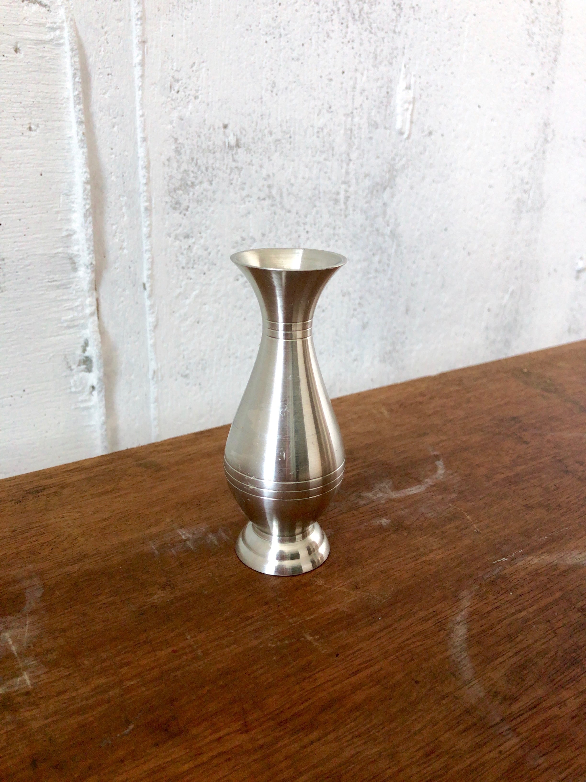 メタル製のマットな質感がお部屋をしゅっと引き締めてくれる一輪挿しです。小振りなサイズ感も可愛いです。特にがたつきもなく、日常気軽にお使いいただけます。卓上で生花やドライフラワーなどを入れて、卓上や小引出しの横にさりげなく置いてみると、感じ良く映ってくれます。