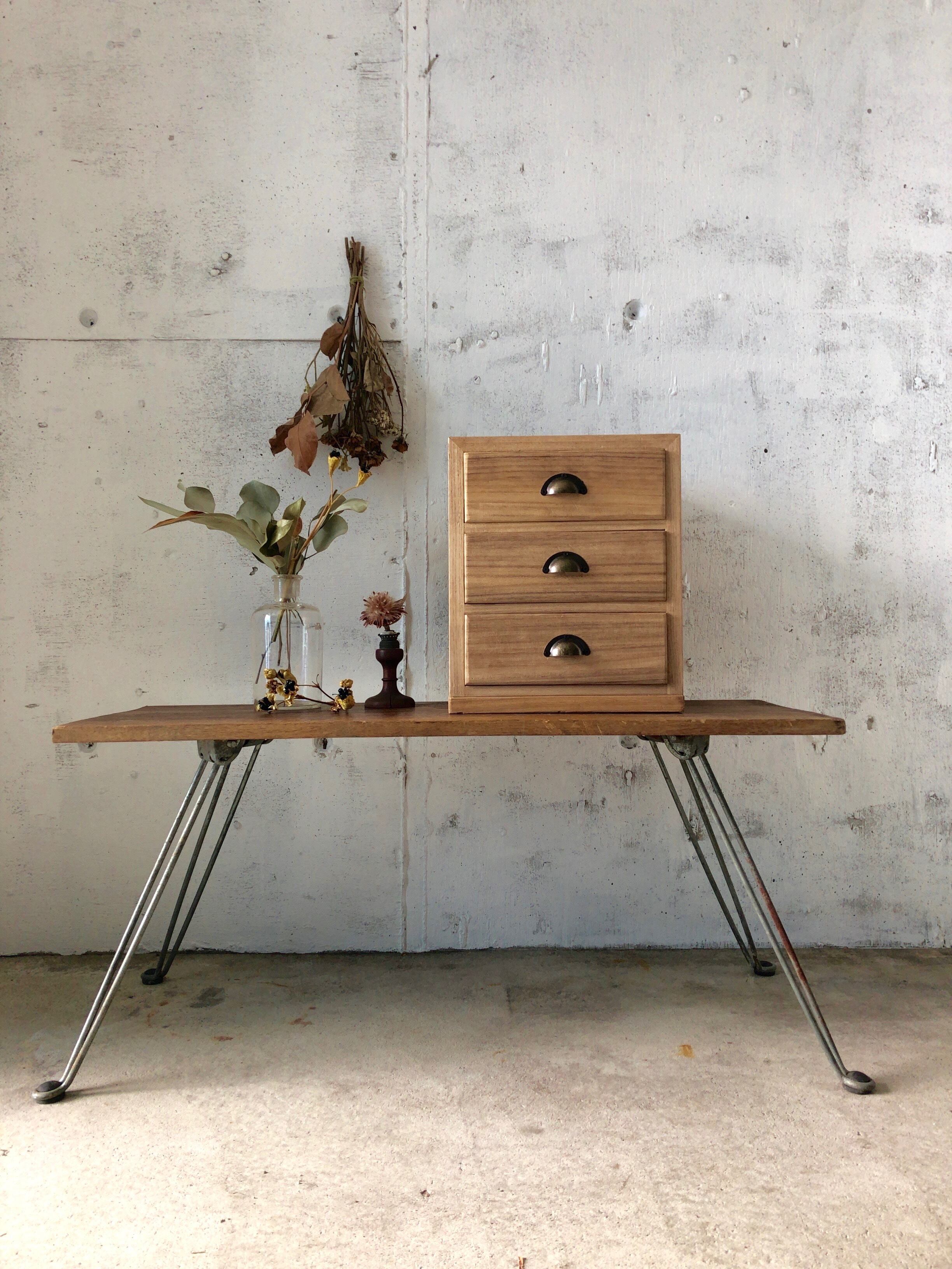 経年変化のナチュラルな木肌、真鍮取手が感じ良い小引き出し。引出し中は綺麗で開閉も比較的スムーズに行え、日常気軽にお使いいただけます。お部屋のカウンター上やリビング、作業場などで細々したものやステーショナリーの整理に役立ちそうです。