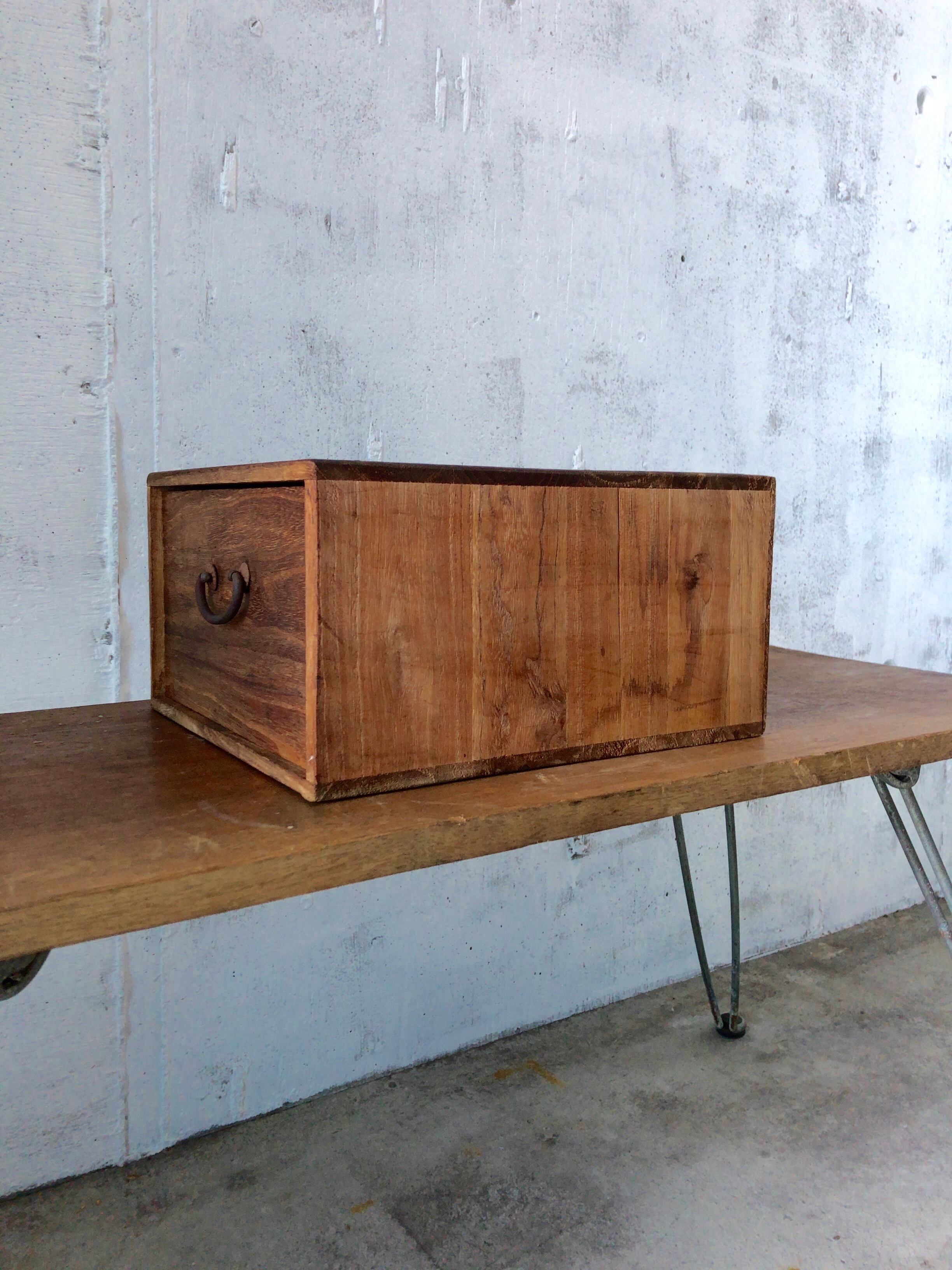 経年変化の良い木肌、味のある取手が雰囲気の良い小引き出し。小振りなサイズ感が可愛らしく、使い易いです。引出し中は少し汚れがありますが開閉はスムーズに行え、日常気軽にお使いいただけます。作業場で細々した材料、パーツ入れにしてみたり、アクセサリーなどの収納にしてみても素敵です。卓上で隣に少し大きめの小引き出しを置いて植物などを飾ってみても、バランスの良い空間が出来上がりそうです。