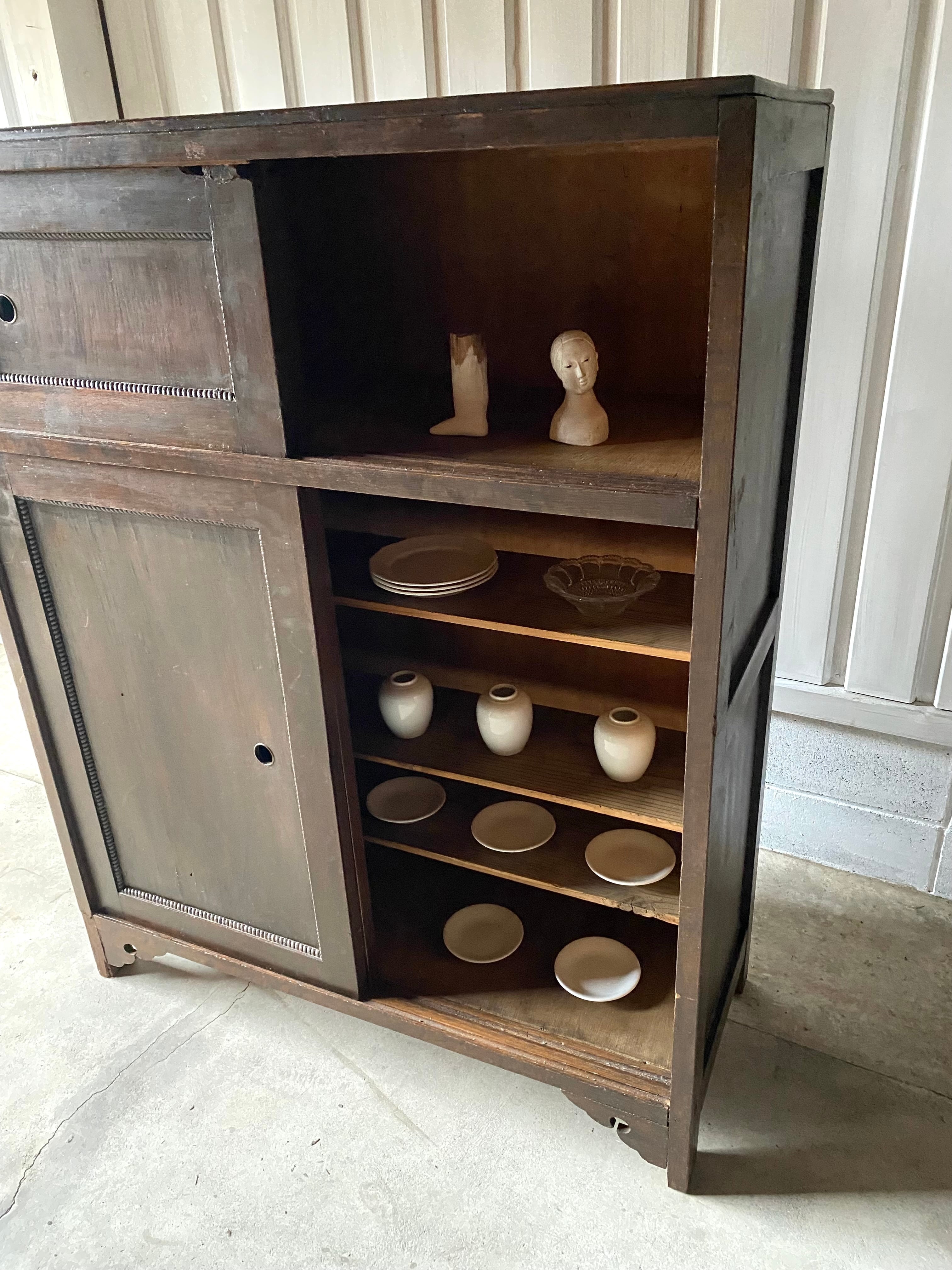 古い収納棚になります。スレや剥げ、割れ、欠け、サビ、落としきれない汚れなどがあります。引戸の開閉は比較的スムーズに行えます。全体的に状態も良いのでまだまだ実用的に活躍してくれます。