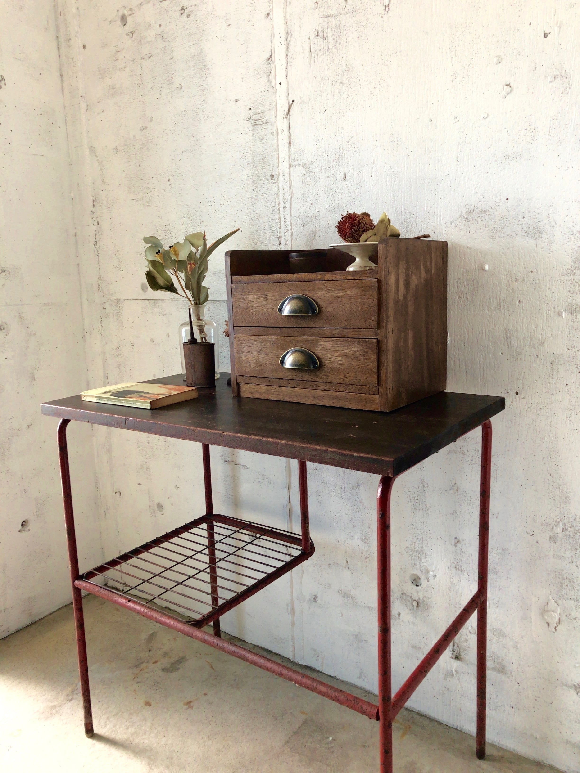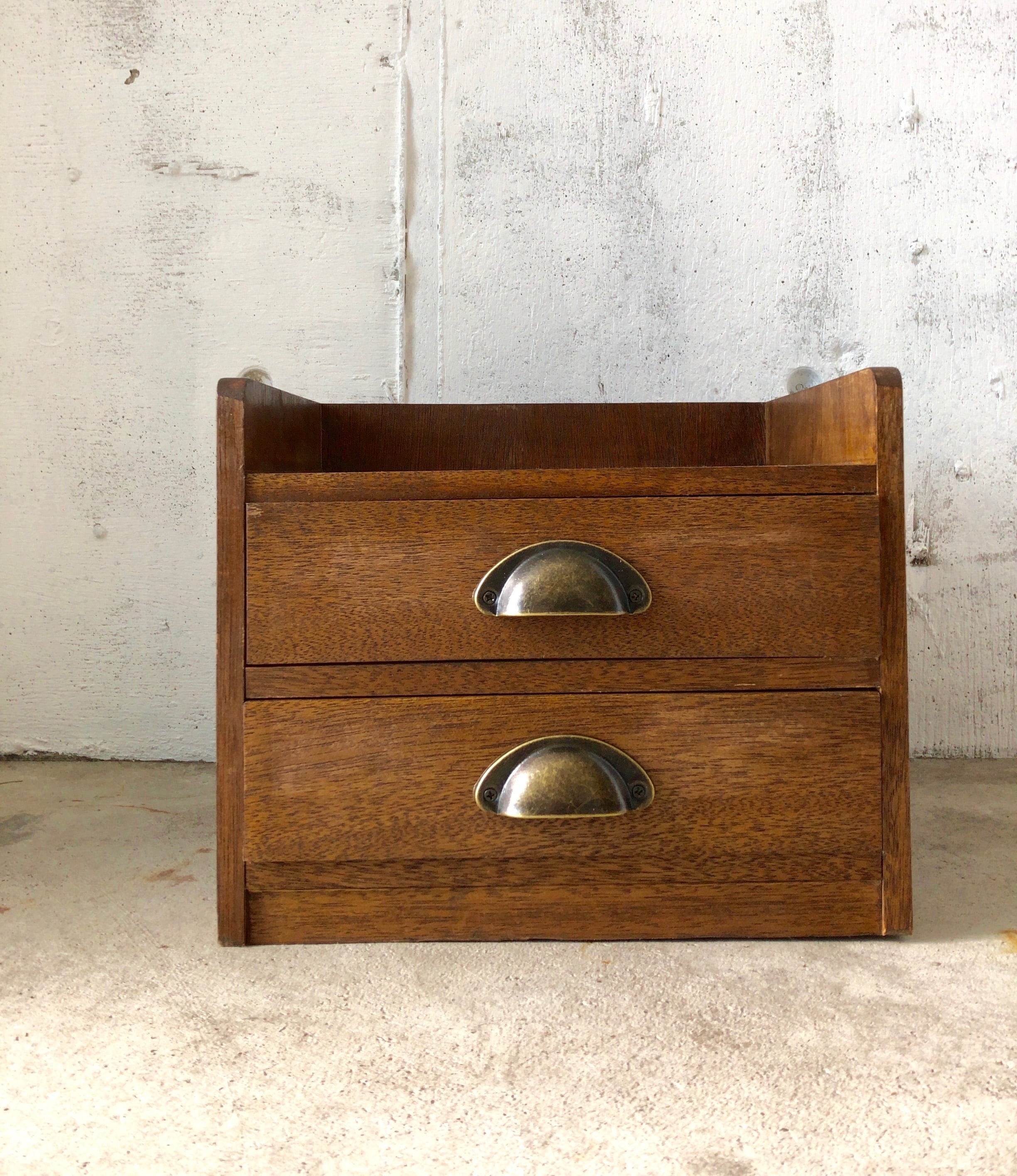 経年変化の味のある木肌、雰囲気の良い真鍮取手が感じ良い小引き出し。引出し中は少し汚れがありますが、開閉はスムーズに行え日常気軽にお使いいただけます。天板に飾るスペースがあるので、お部屋でお気に入りの小物や植物をディスプレイしながら細々したものを収納しても素敵です。