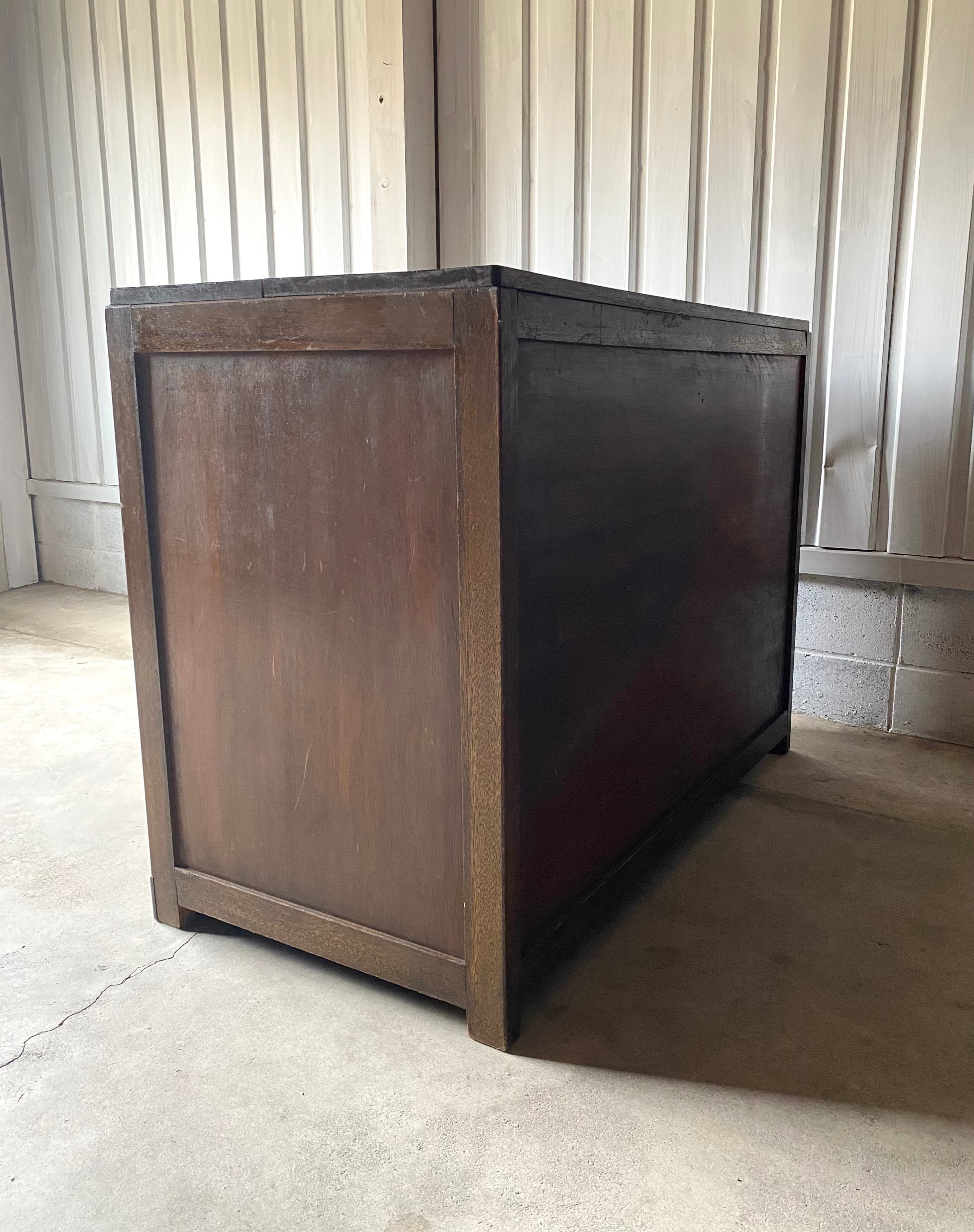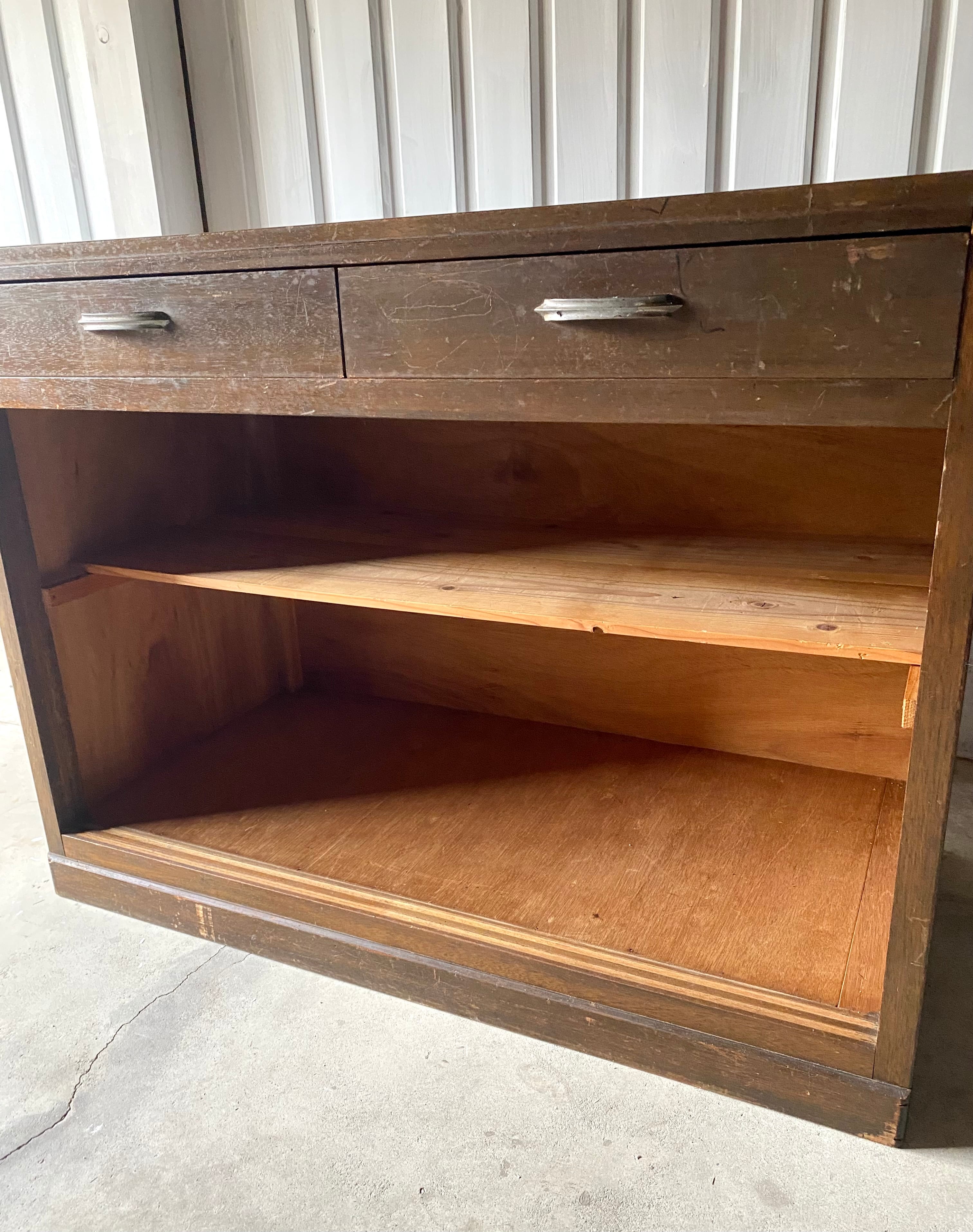 古いシェルフになります。スレや剥げ、反り、欠け、隙間、サビ、当たりキズ、落としきれない汚れなどがあります。引戸、引出しの開閉は比較的スムーズに行えます。特に目立つガラスの割れはなく、全体的に状態も良いのでまだまだ実用的に活躍してくれます。