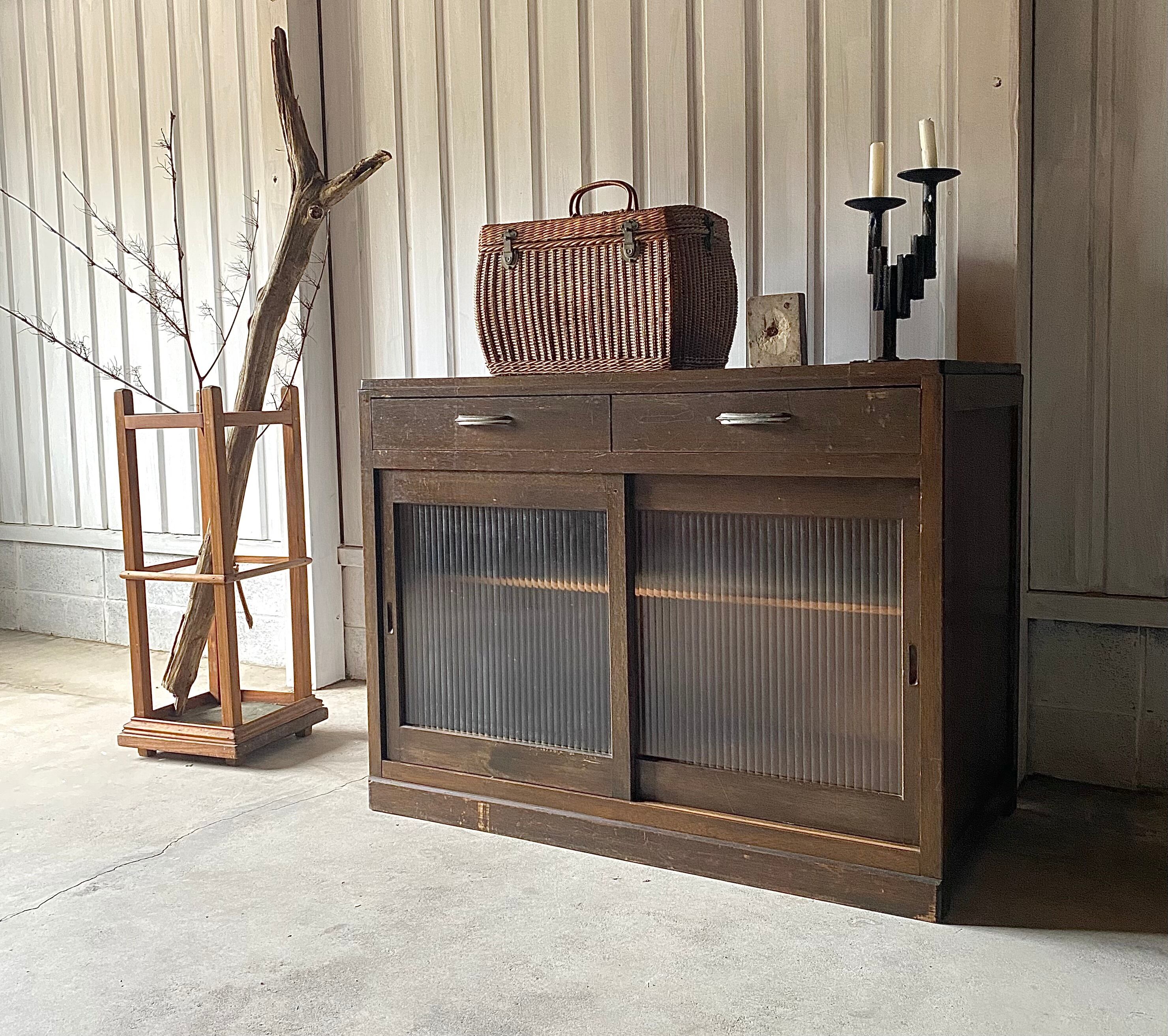 経年変化の落ち着きある佇まい、モールガラスの引戸が感じ良いシェルフ。キッチンで食器や調味料のストック棚としてや、リビングやアトリエで本や書類、小物などの収納としても素敵です。