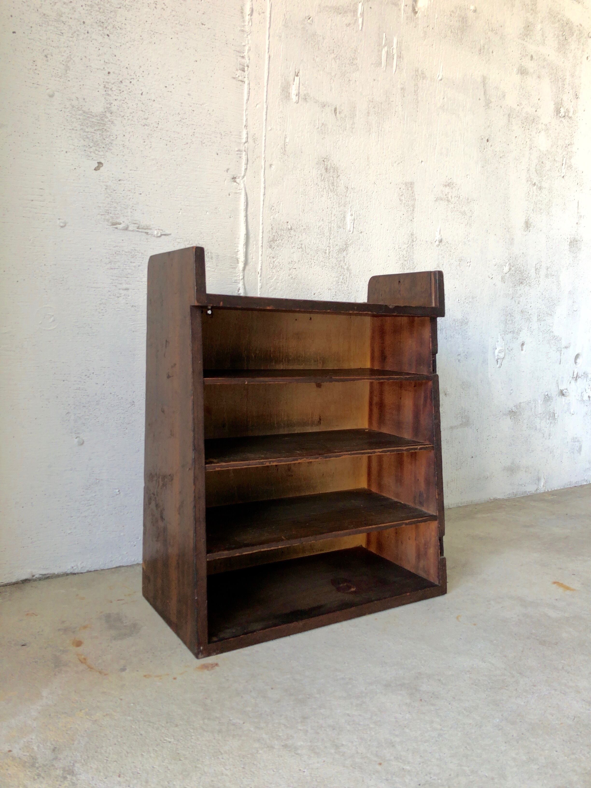 経年変化の濃い木味、レトロな雰囲気が感じ良い収納棚。特に目立つがたつきなどなく、状態は良いです。お部屋の卓上に置いて、アクセサリーや材料などの小物の収納、紙物の収納にも役立ちそうです。