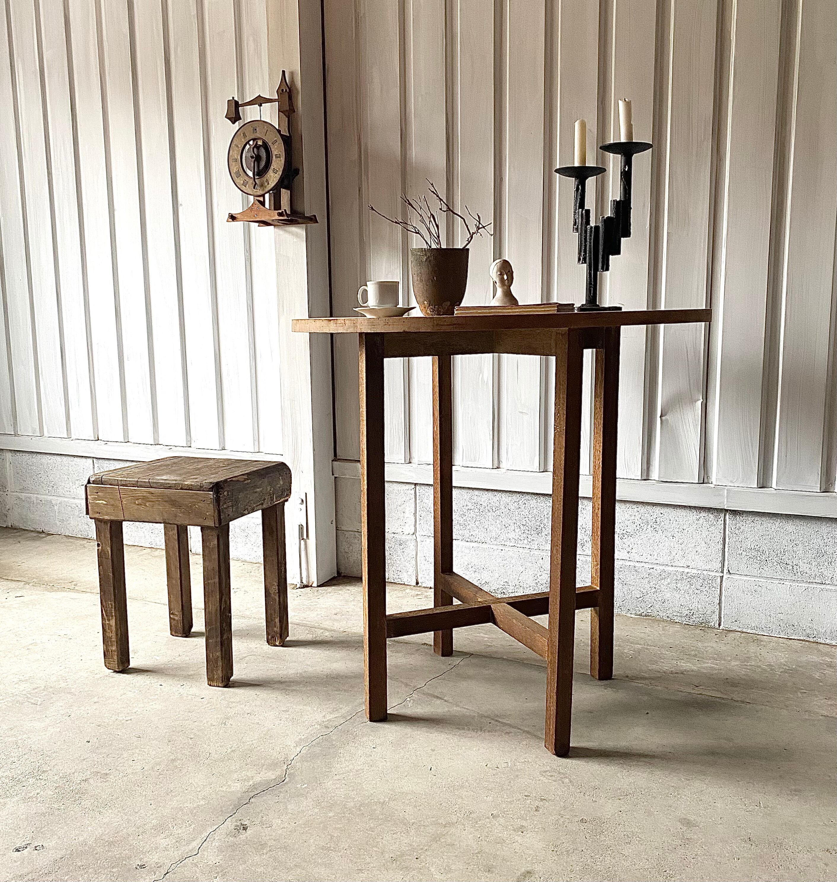 古いラウンドテーブルになります。スレや剥げ、反り、欠け、当たりキズ、落としきれない汚れなどがあります。少しのがたつきはありますが、全体的に状態も良いのでまだまだ実用的に活躍してくれます。