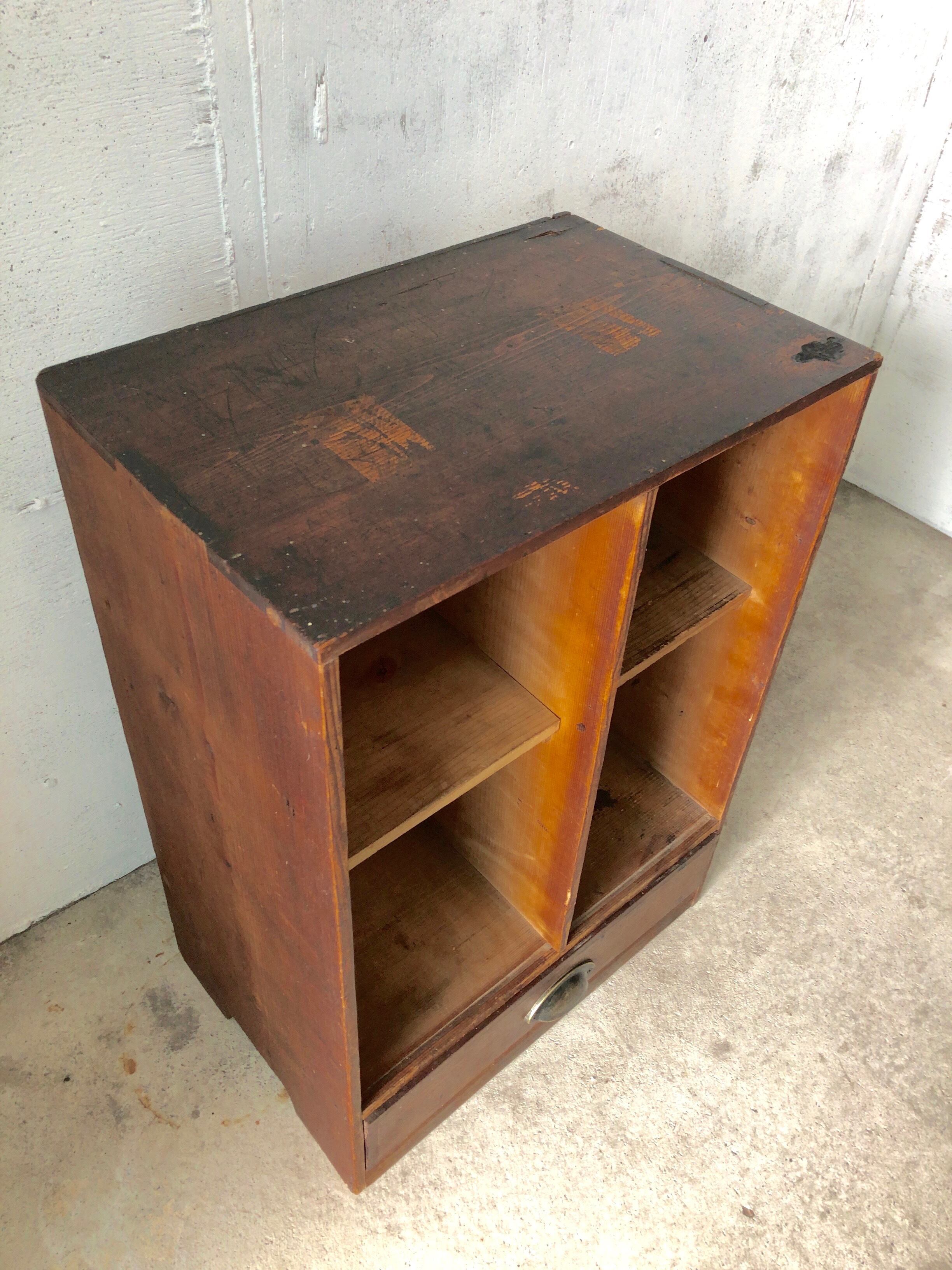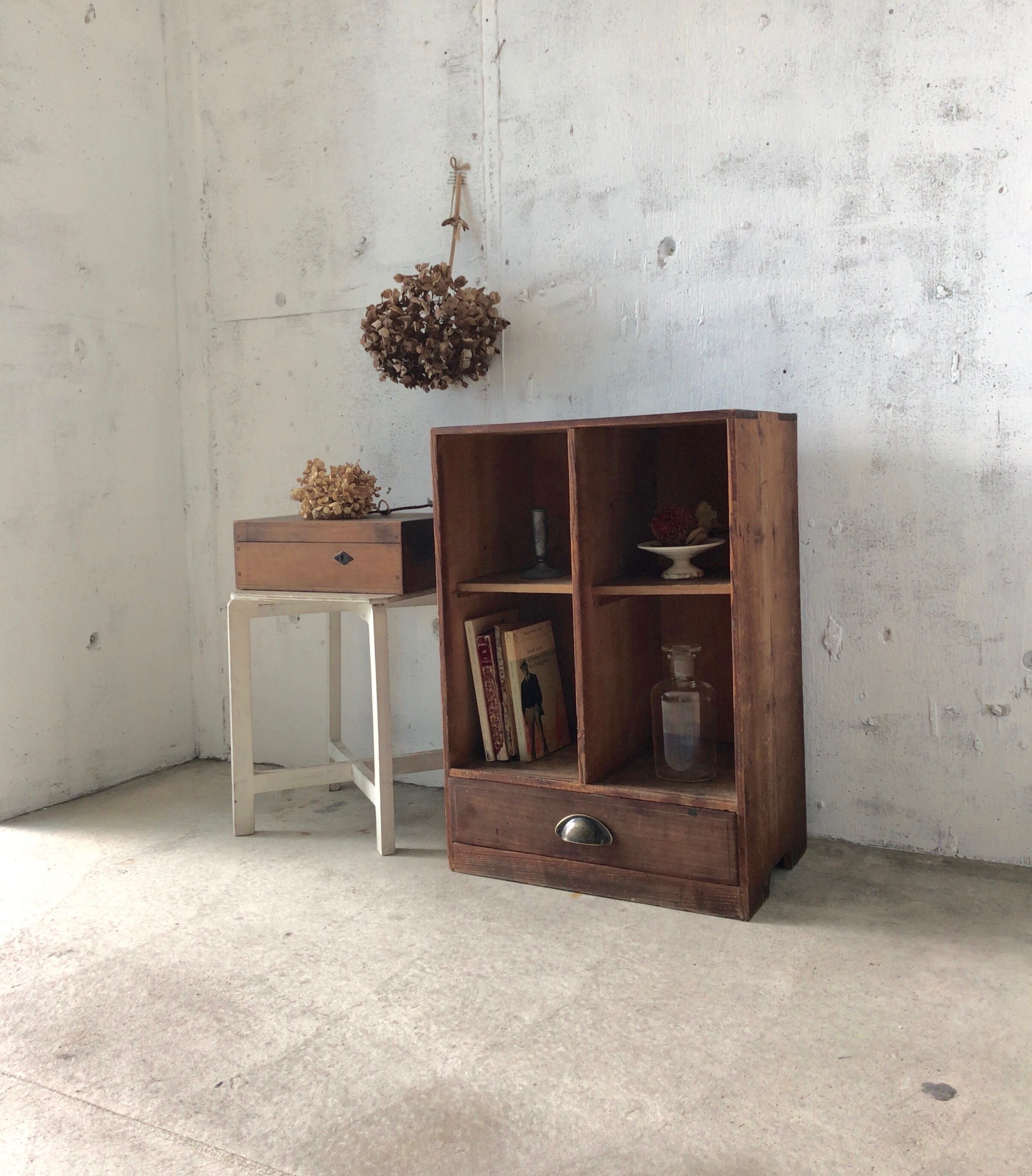古い収納棚になりますので、スレや剥げ、当たりキズ、欠け、割れ、落としきれない汚れなどがあります。引出し中は少し汚れがありますが開閉はスムーズに行え、日常気軽にお使いいただけます。全体的に状態も良いのでまだまだ実用的に活躍してくれます。